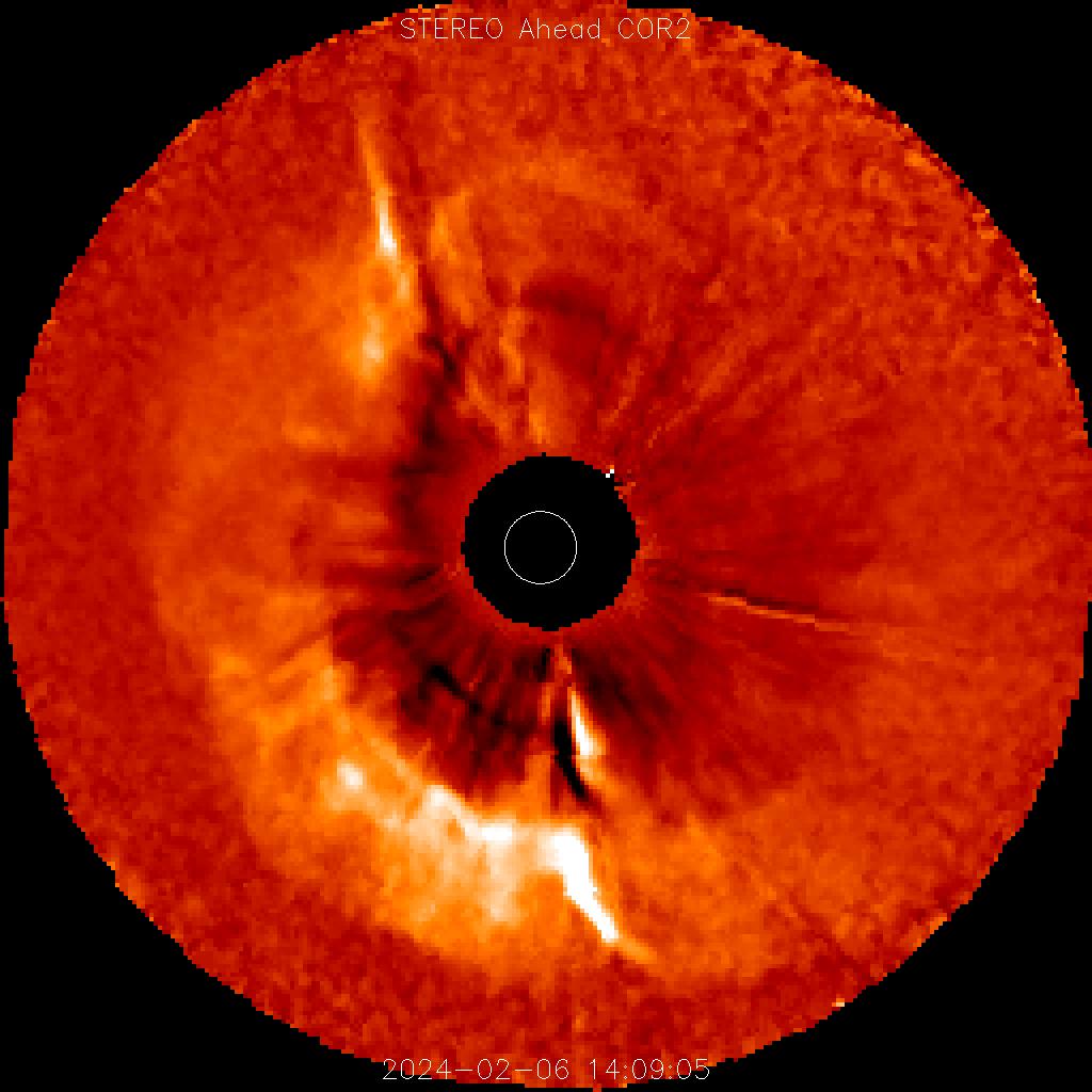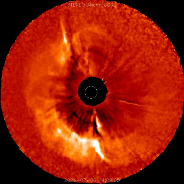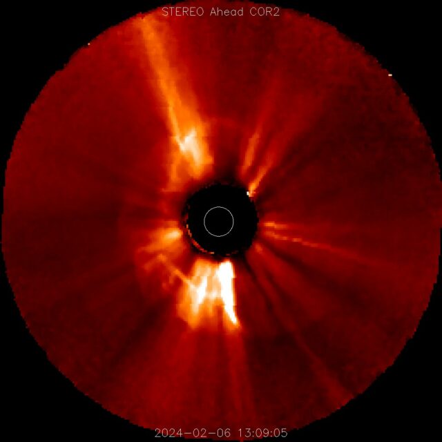 We wtorek 6 lutego po południu na Słońcu wystąpiły prawdopodobnie dwa wyrzuty plazmy (CME). Jeden od strony Ziemi, plazma powinna minąć nas od północy, a drugi prawdopodobnie dokładnie po drugiej stronie Słońca względem Ziemi.