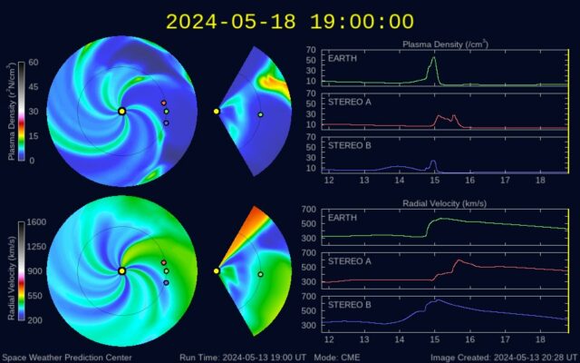 Rozbłyskom towarzyszył duży wyrzut plazmy, której większość poleciała na zachód, ale część w nocy z wtorku na środę (14/15 maja) prawdopodobnie zahaczy Ziemię.