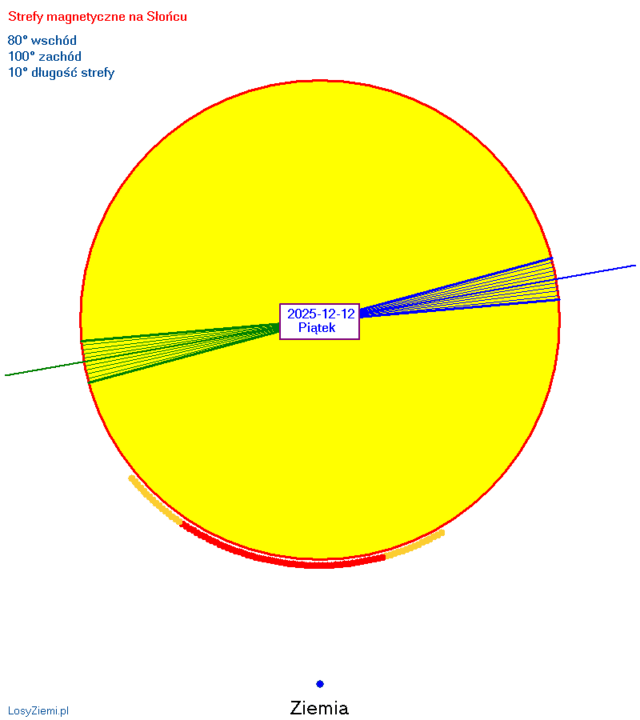 Szczyt silnej strefy magnetycznej wystąpi w piątek 12 grudnia na 80 stopniu wschodnim oraz na 100 stopniu zachodnim. Długość strefy może wynieść 10 stopni. Strefy tworzą się na kilka dni przed szczytami, ich polaryzacja słabnie przez kilka dni po szczytach. W przypadku silnych stref nawet do 6 dni, przy czym nie są to zmiany liniowe, a duży wzrost widoczny jest zazwyczaj dopiero po połowie tego czasu.