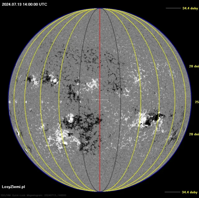 Silna strefa magnetyczna wystąpi w poniedziałek 22 lipca na 56 stopniu wschodnim oraz na 124 stopniu zachodnim. Długość strefy może wynosić aż 28 stopni. Strefy tworzą się na kilka dni przed szczytami, ich polaryzacja słabnie przez kilka dni po szczytach. W przypadku silnych stref nawet do 6 dni.