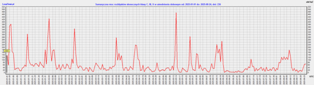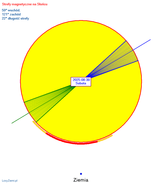 Szczyt silnej strefy magnetycznej wystąpi w sobotę 30 sierpnia na 59 stopniu wschodnim oraz na 121 stopniu zachodnim. Długość strefy może wynieść aż 22 stopnie. Strefy tworzą się na kilka dni przed szczytami, ich polaryzacja słabnie przez kilka dni po szczytach. W przypadku silnych stref nawet do 6 dni, przy czym nie są to zmiany liniowe, a duży wzrost widoczny jest zazwyczaj dopiero po połowie tego czasu.