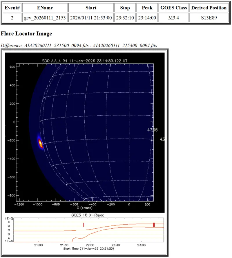 W niedzielę 11 stycznia o 23:14 UTC wystąpił szczyt silnego rozbłysku na Słońcu klasy M3.4 na 89 stopniu wschodnim.