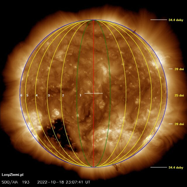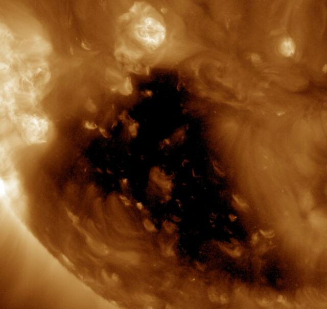 Na południowym-wschodzie tarczy Słońca utworzyła się duża dziura koronalna. Struktury te dominują w minimum słonecznym, a dość rzadkie są w maksimum.