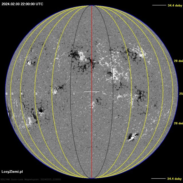 Średniej siły strefa magnetyczna wystąpi w niedzielę 11 lutego na 40 stopniu wschodnim i 140 stopniu zachodnim, długość strefy może wynosić zaledwie 4 stopnie. Strefy tworzą się na kilka dni przed szczytami, ich polaryzacja słabnie przez kilka dni po szczytach.