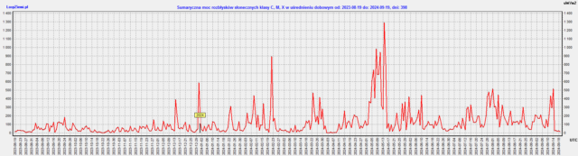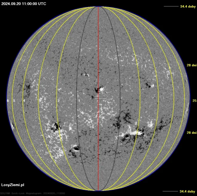 Szczyt średniej siły strefy magnetycznej wystąpi w środę 25 września na 16 stopniu wschodnim oraz na 164 stopniu zachodnim. Długość strefy może wynosić 10 stopni. Strefy tworzą się na kilka dni przed szczytami, ich polaryzacja słabnie przez kilka dni po szczytach. W przypadku silnych stref nawet do 6 dni.