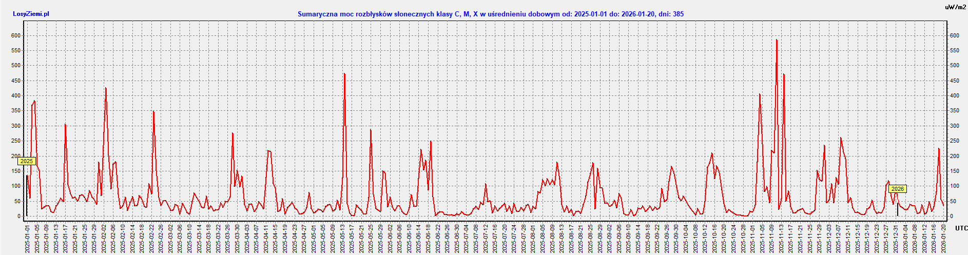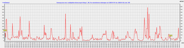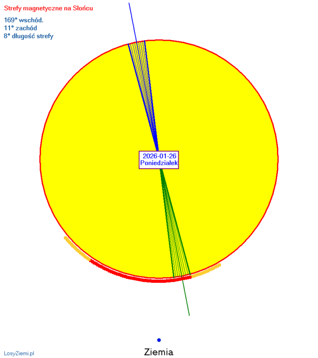 Szczyt średniej siły strefy magnetycznej wystąpi w poniedziałek 26 stycznia na 11 stopniu zachodnim oraz na 169 stopniu wschodnim. Długość strefy może wynieść około 8 stopni. Strefy tworzą się na kilka dni przed szczytami, ich polaryzacja słabnie przez kilka dni po szczytach. W przypadku silnych stref nawet do 6 dni, przy czym nie są to zmiany liniowe, a duży wzrost widoczny jest zazwyczaj dopiero po połowie tego czasu.