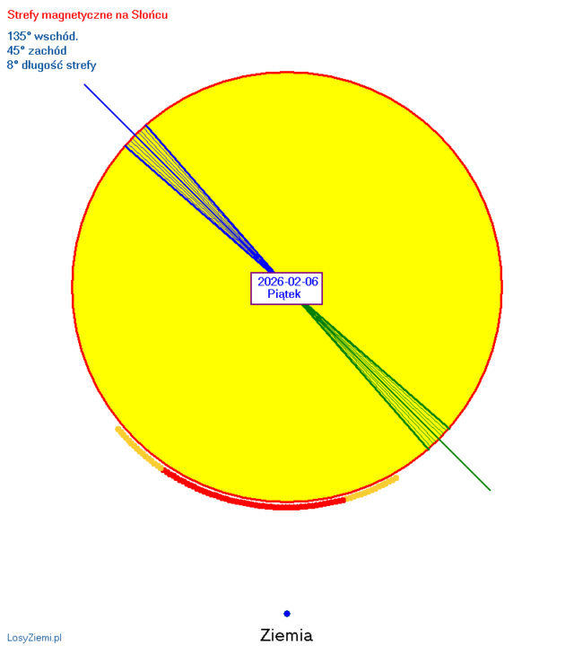 Szczyt kolejnej średniej siły strefy magnetycznej wystąpi w piątek 6 lutego na 45 stopniu zachodnim oraz na 135 stopniu wschodnim. Długość strefy może wynieść również około 8 stopni.