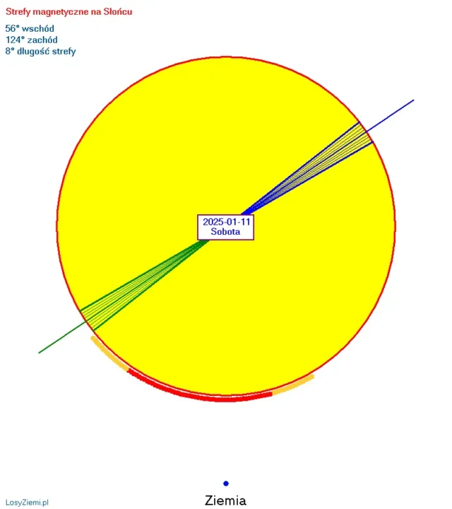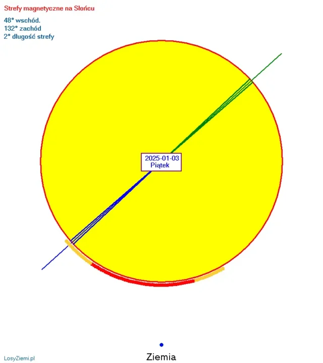 Szczyt średniej siły strefy magnetycznej wystąpi w piątek 3 stycznia na 48 stopniu wschodnim oraz na 132 stopniu zachodnim. Długość strefy może wynosić tylko 2 stopnie. Szczyt kolejnej średniej siły strefy magnetycznej wystąpi w sobotę 11 stycznia na 56 stopniu wschodnim oraz na 124 stopniu zachodnim. Długość strefy może wynosić 8 stopni. Strefy tworzą się na kilka dni przed szczytami, ich polaryzacja słabnie przez kilka dni po szczytach. W przypadku silnych stref nawet do 6 dni.