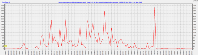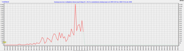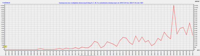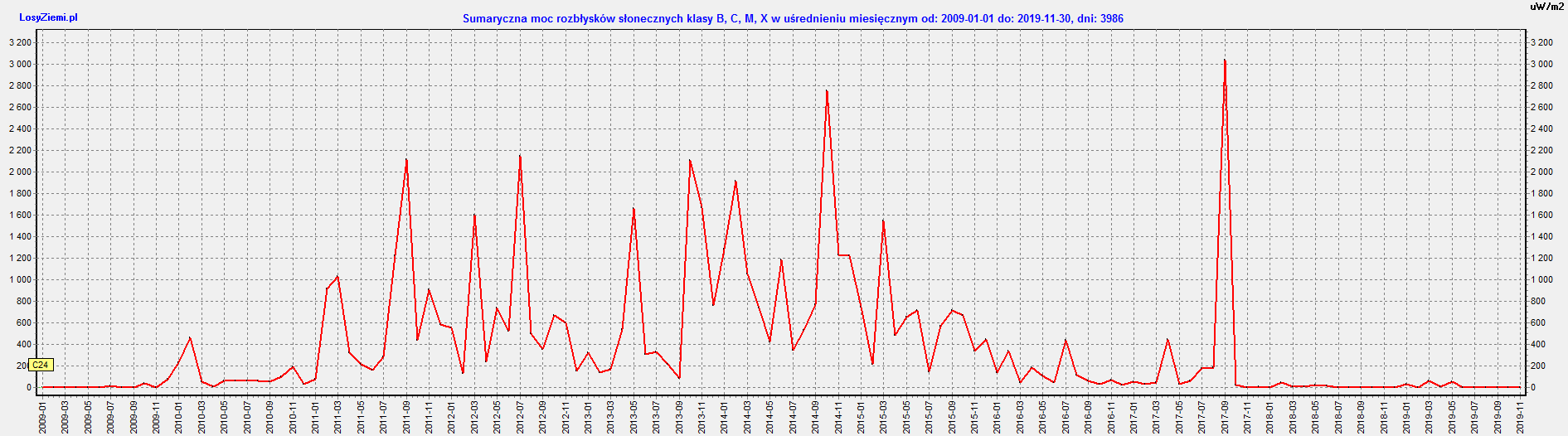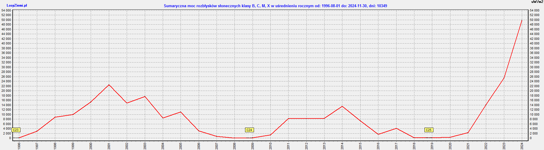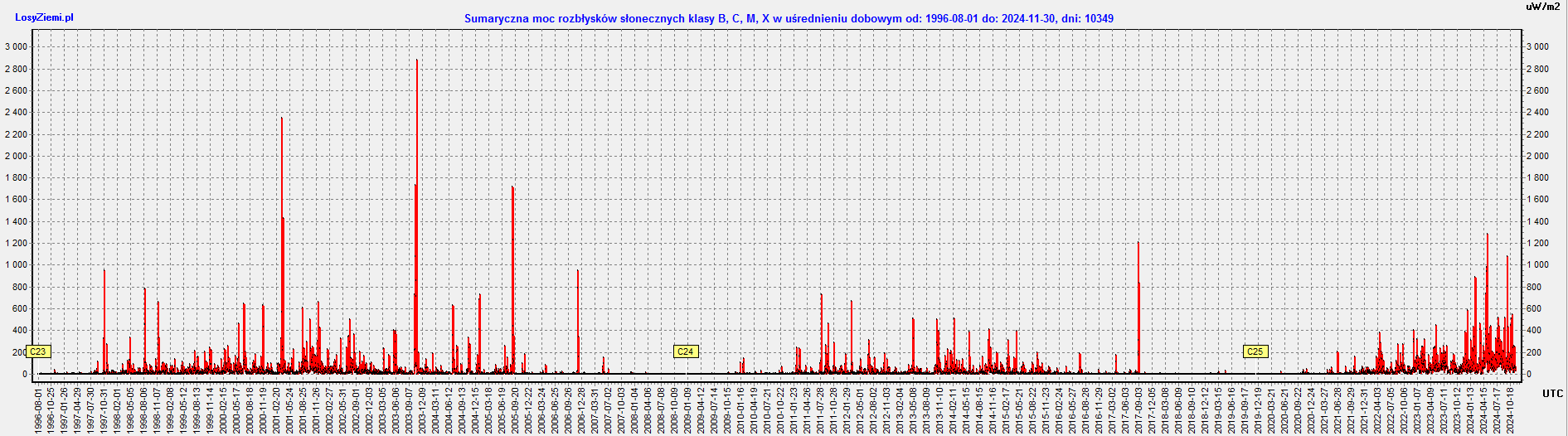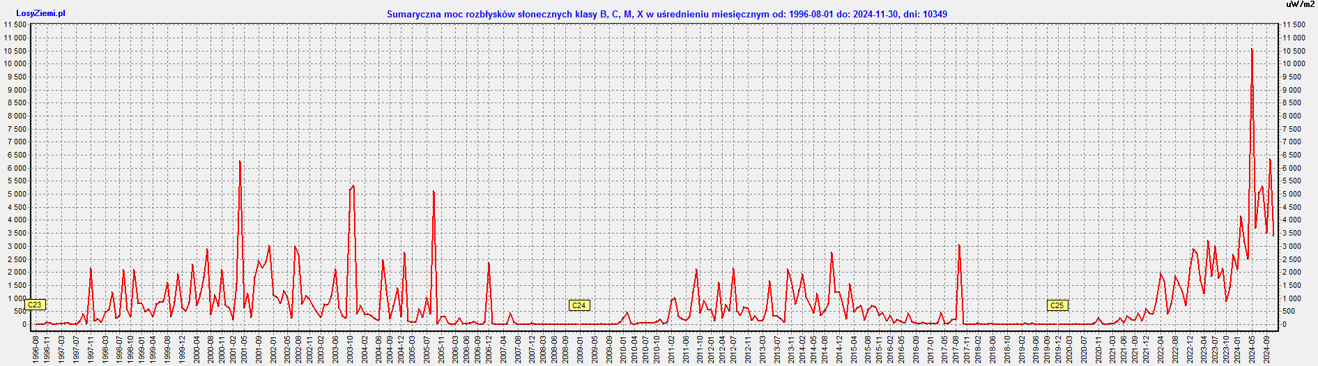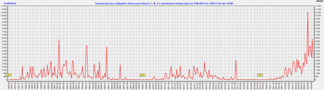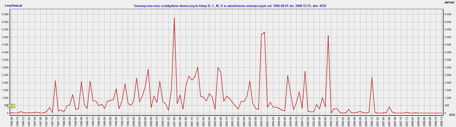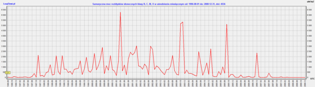 Od 1 sierpnia 1996 roku Słońce wygenerowało 28 rozbłysków od klasy X5.0, co daje moc od 500 uW/m2. Wszystkich rozbłysków klasy X w tym okresie mieliśmy 245.