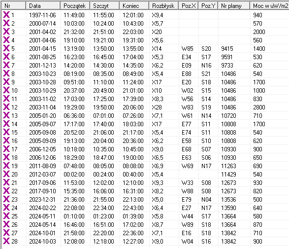 Poniżej lista rozbłysków słonecznych od klasy X5.0