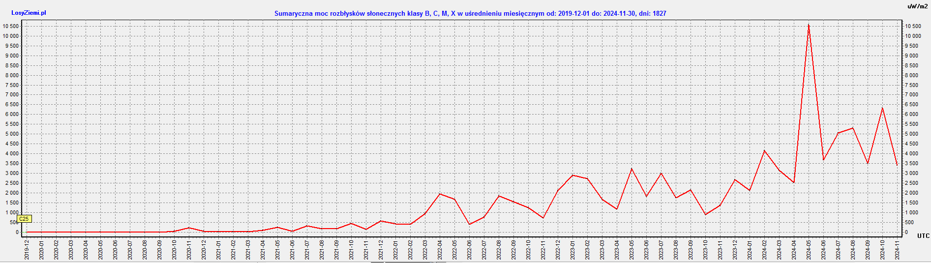 Cykle słoneczne 23, 24 i 25 w uśrednieniu miesięcznym od 1 sierpnia 1996 roku do 30 listopada 2024 roku.