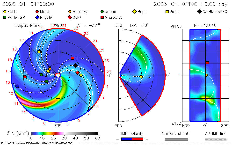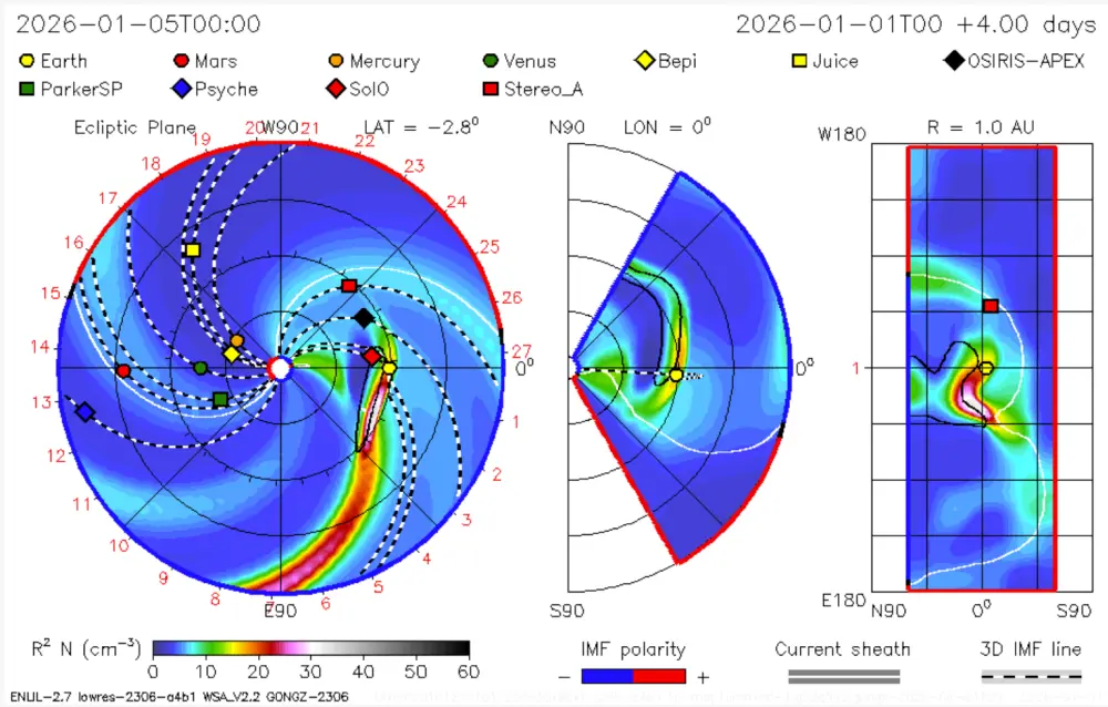 Burza geomagnetyczna prognozowana między na noc 2/3 stycznia została przesunięta o 12 godzin do przodu, a prognoza gęstości plazmy zmniejszona o połowę, więc jeśli wystąpi, będzie niezbyt silna.
