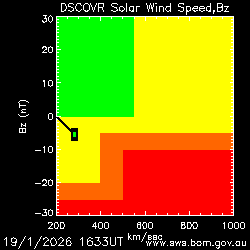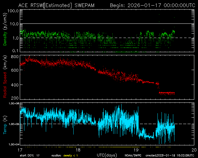 Wystąpił znaczący spadek prędkości wiatru słonecznego poniżej 300 km/s. Takie spadki najczęściej występują tuż przed pędzącą chmurą plazmy.