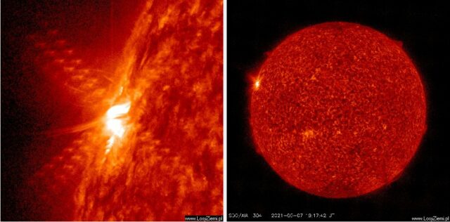 Rozbłysk rozpoczął się o 20:45 i nadal trwa. Jego energia była dużo większa, ale z powodu dużego kata do Ziemi dotarło „tylko” M3.91.