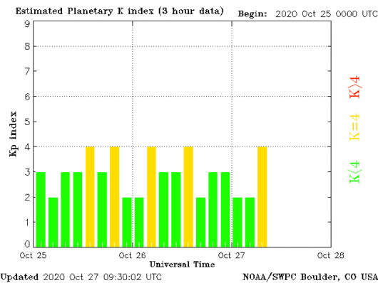 Nadal trwa średniej siły burza geomagnetyczna, Kp index sięga 4.