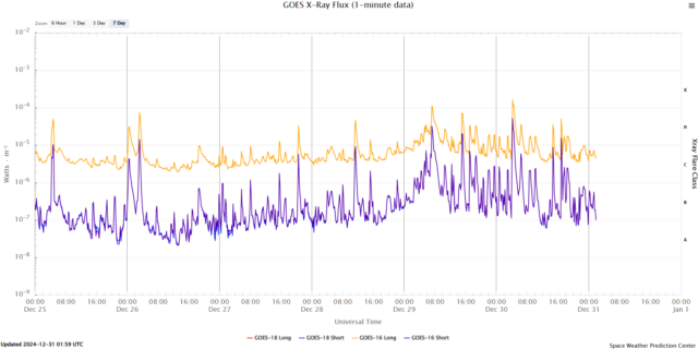 W poniedziałek 30 grudnia o 5:14 czasu w Polsce wystąpił szczyt bardzo silnego rozbłysku słonecznego klasy X1.5 na 46 stopniu zachodnim z plamy 3936. Zaledwie 17 minut później o 5:31 wystąpił szczyt kolejnego bardzo silnego rozbłysku klasy X1.1 na 50 stopniu zachodnim z plamy 3932.