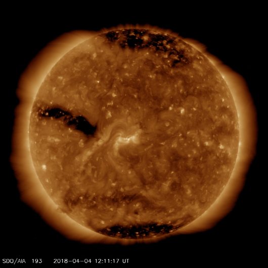 W nocy z czwartku na piątek (5/6 kwietnia) zacznie oddziaływać na nas dziura koronalna (DK), która pozycję na wprost Ziemi osiągnie w niedzielę, 8 kwietnia.