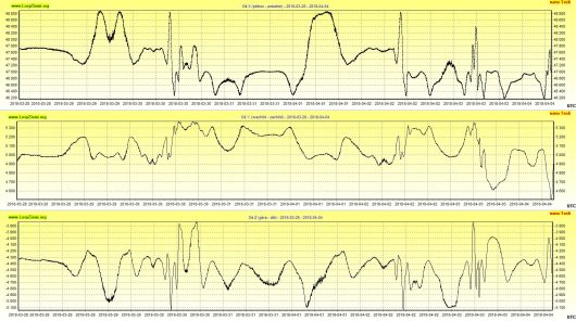 Poniżej taka ciekawostka: Rezonans Schumanna mierzony w Tomsku w Rosji (UTC+7h) oraz moje pomiary składowych ziemskiego pola 27-30 marca.
