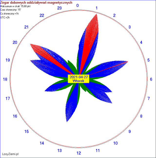 W poniedziałek 26 kwietnia rozpoczęły się średniej siły oddziaływania magnetyczne planet. Osoby wrażliwe na zmiany magnetyczne, oddziaływania mogą odczuwać na ponad dobę przed szczytami i po szczytach w formie: bólu głowy, bólu stawów, zmęczenia i szumów usznych często z modulacjami. Drgania ziemskiego pola magnetycznego występują za sprawą jonosfery gromadzącej elektrony protony z rekoneksji magnetycznych emisji z plam i dziur koronalnych oraz wiatru słonecznego. Na szumy uszne bardzo mocno wpływają dziury koronalne.